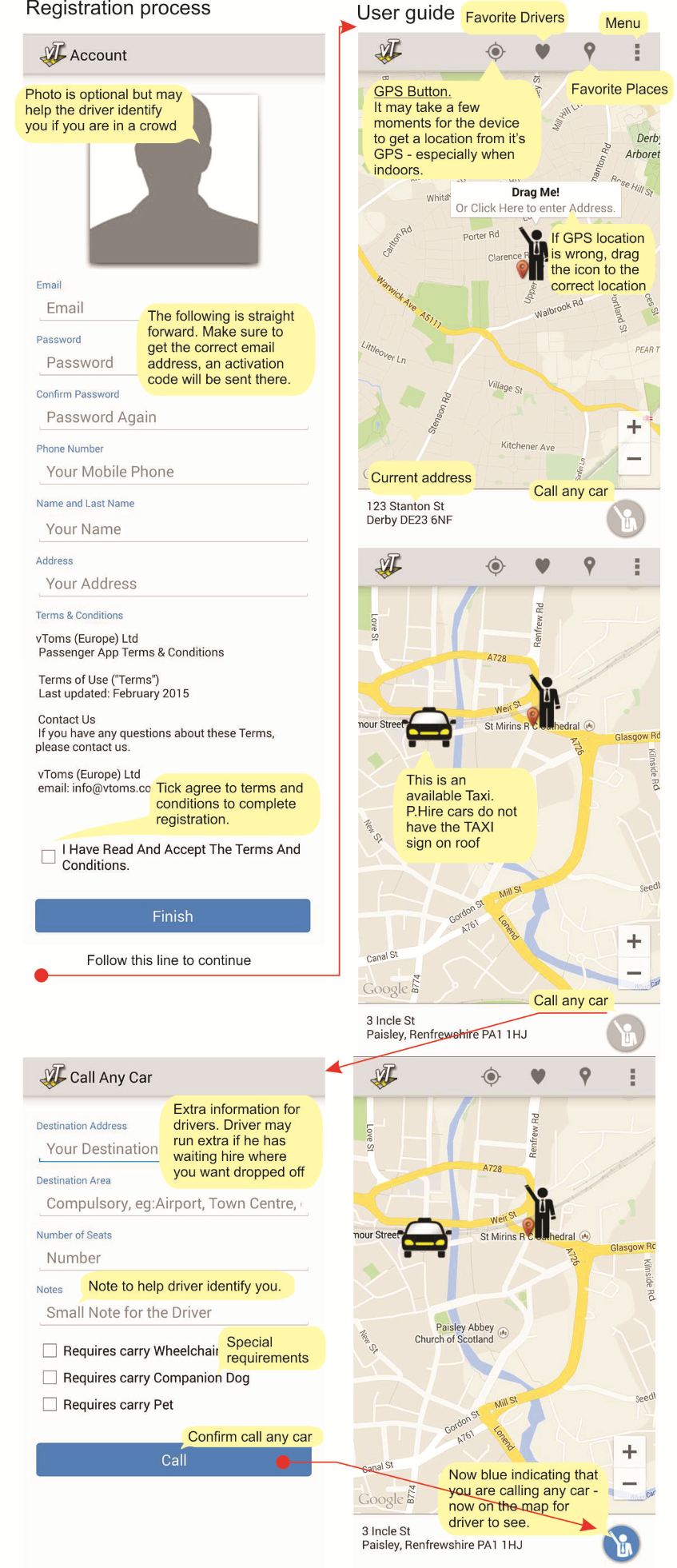 vToms operates different from the traditional booking office where you, as a passenger, make a call and are assigned a driver. vToms is completely different in that you, can decide what driver you want or a particular type of vehicle, ie wheelchair access, one that takes pets etc. Once you download the Passenger App you are in control. When you start to use it, you can build a list of favourite drivers, add all your places where you normally get picked up etc. You can filter menus each time you use the app. ie you want a Taxi with a meter in it, you can ask the app to show you Taxis only, or if you normally use Private Hire then filter out Taxis and ask to see Private Hire only. Once you have used the app a few times and get to know drivers you can add the driver to your favourites list and then in the future ask the app to show you only Favourite Drivers. Drivers have a built in facility to offer a discount for their favourite customers, so dont be afraid to ask if you give a driver regular work. In a hurry and not too bothered about who collects you then just place yourself on the map for a driver to see you and accept the job. Its easy just press the button in the bottom right hand corner, fill out destination details and wait for a driver to accept your job. Want to know about cars on the map around you, just press on the car to get the full details including how much that particular driver charges per mile. If you know roughly how far you are travelling you can work out the approximate fare you will be charged before booking. All vToms does here is gives the passenger the means to contact a driver without the need of a intermediate. Becoming a vToms Passenger is easy and by following the few simple steps detailed below you will be up and running in minutes.