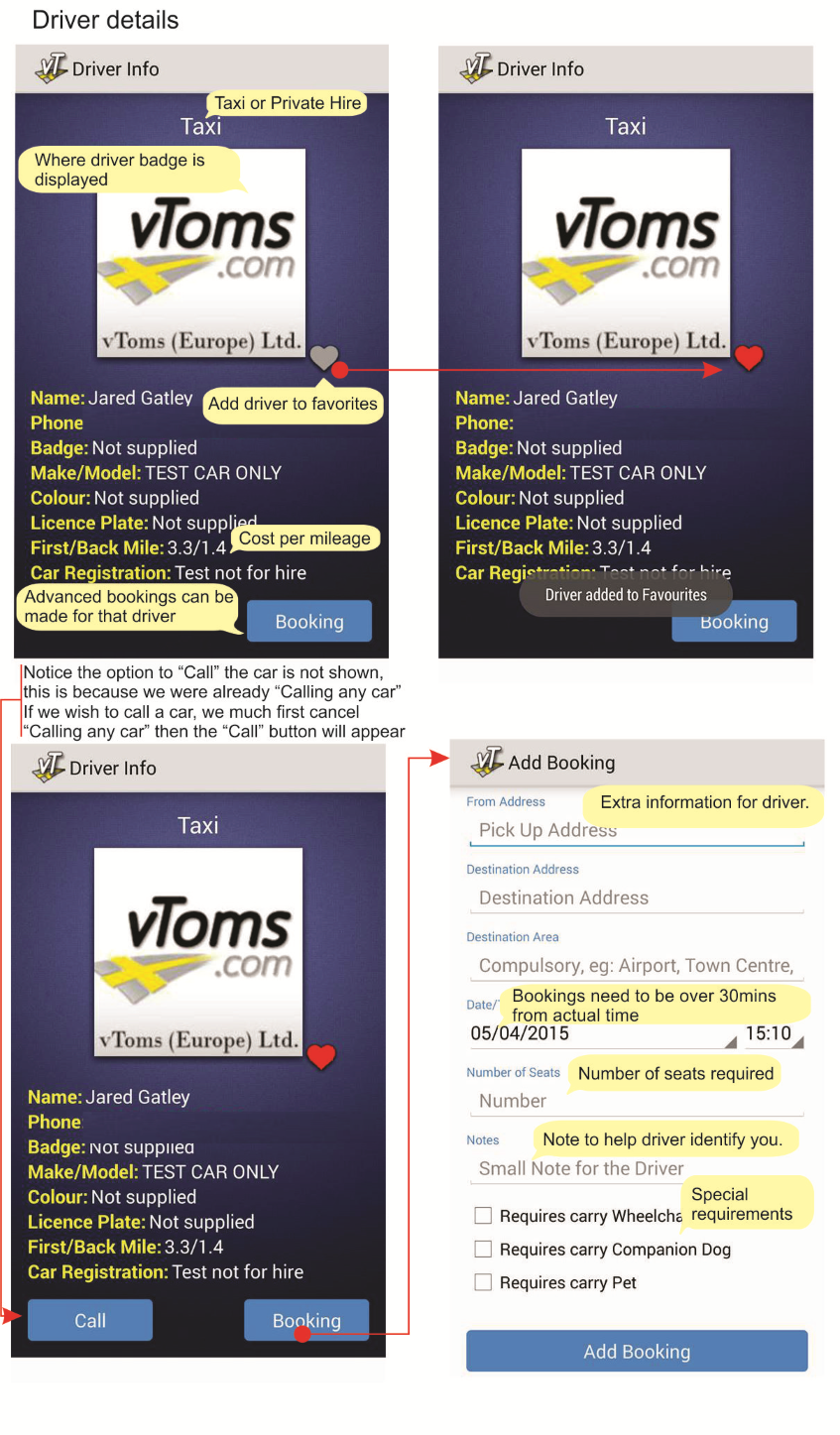 Complete driver details can be accessed by pressing on a car and then pressing on the text bubble that appears above that car. A photograph of the drivers credencial can be viewed along with full car details. The option to book this car and driver is availble to you at the bottom of the screen. You may also add this driver to your favourites list.