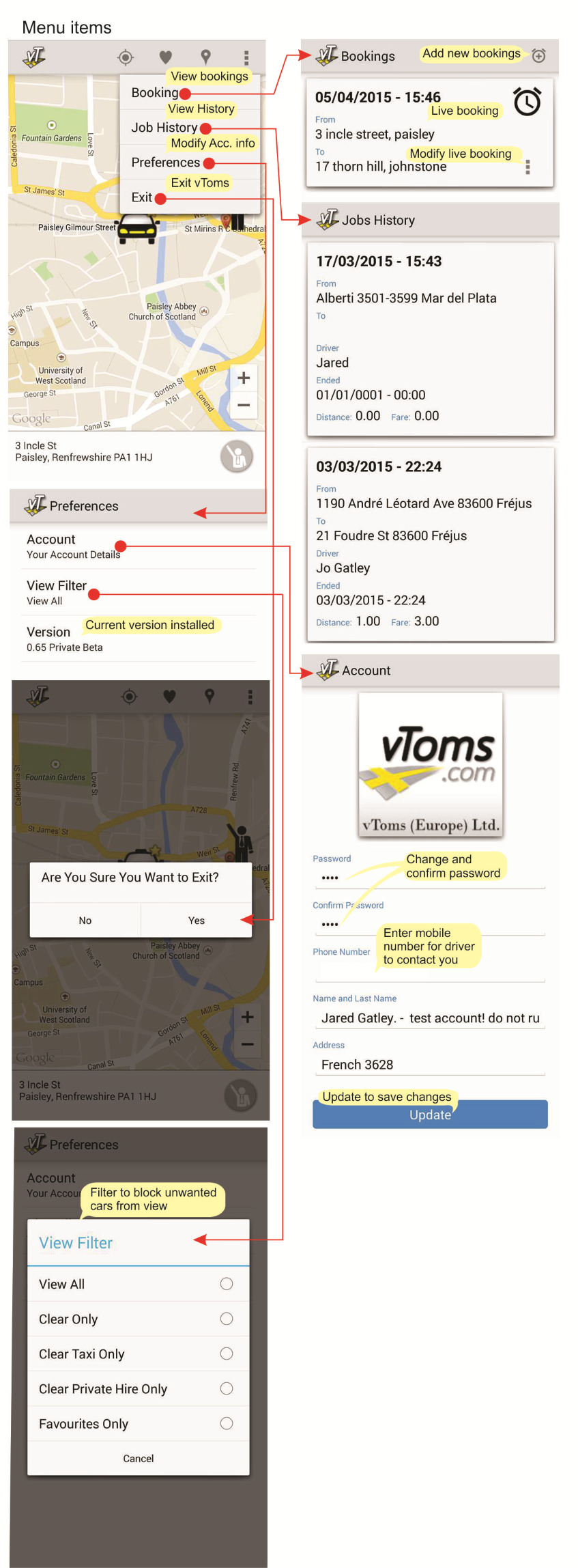 vToms is designed to be used by fully licensed drivers with all necessary authorization. When a driver registers, their details are sent off to the local authority for clarification. By using vToms Passenger your journey details are stored on your phone, in the job history, after completion of the hire. Here you will find the full details of your completed hire along with the driver name and are able to reconnect with that driver if required. If an advanced booking is made for any driver, an email confirming who, with full details including driver mobile number, will be sent to the passenger.